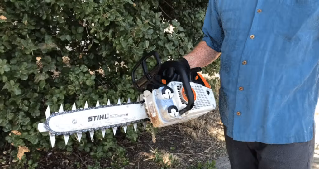 Det fina med detta verktyg är att det fångar upp grenen och håller den mot kedjan så att du kan såga den utan att den flyger överallt.